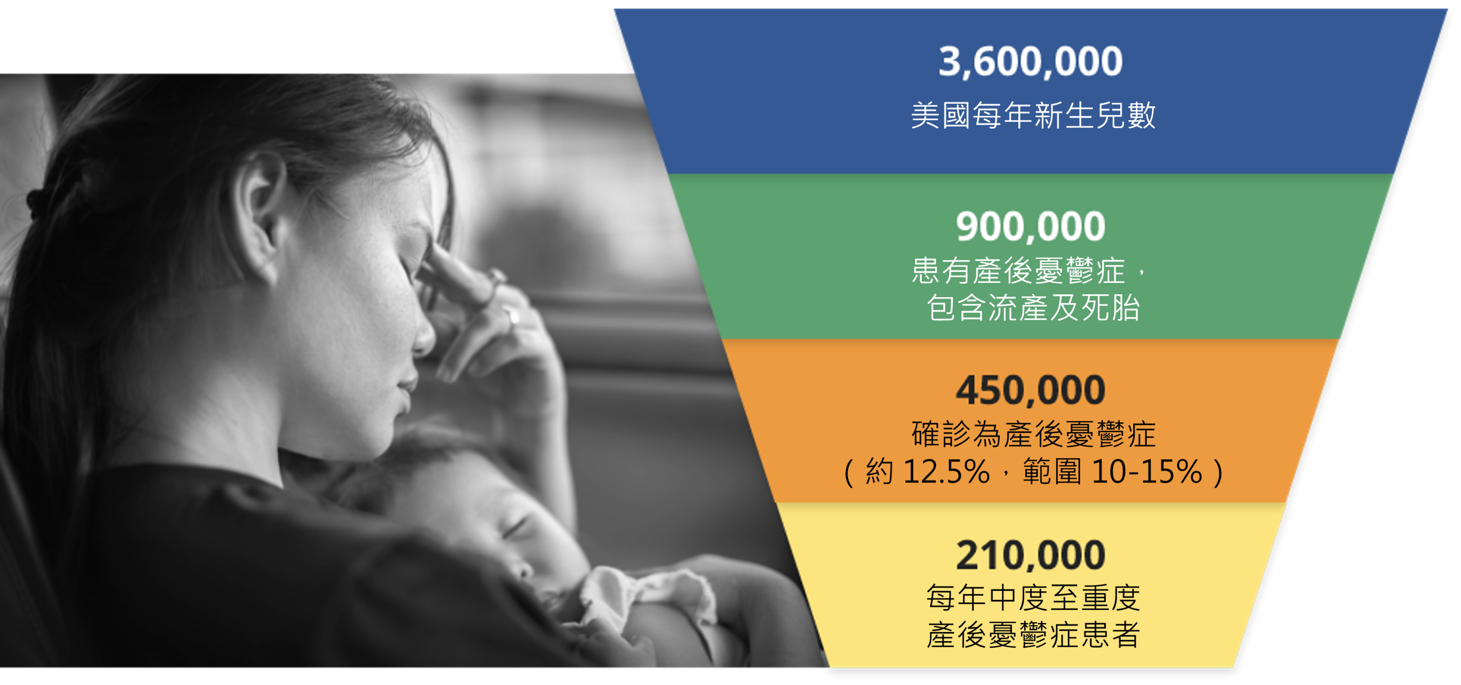 產後憂鬱症 (PPD) 影響部分產後婦女,不僅會對母親造成相當大的痛苦,也會影響其身邊的家人。據報告,全球有 1.21 億名婦女受到影響。在美國,每年有超過 90 萬名婦女經歷「嬰兒憂鬱」,此數據包含死胎和流產的婦女;其中有 45 萬名母親被診斷出患有產後憂鬱症。